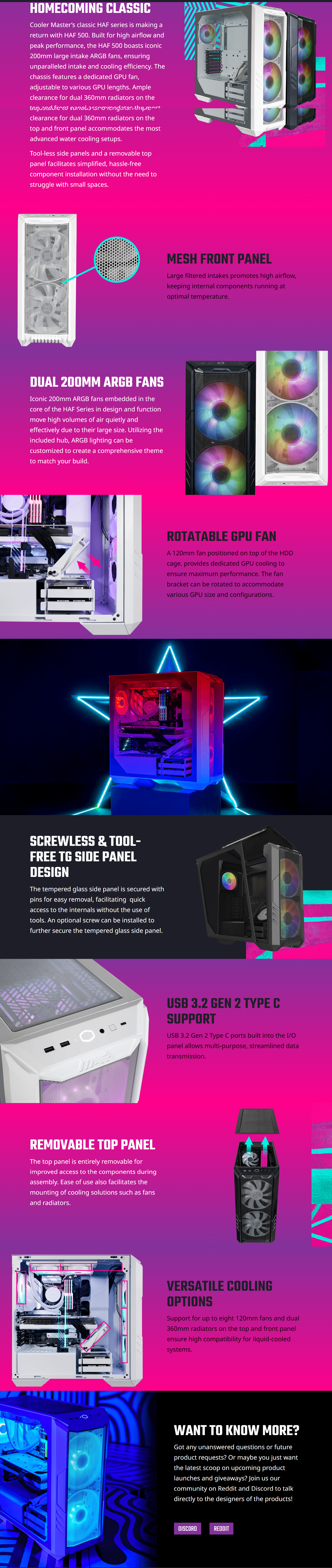 | FAN SUPPORT – FRONT | 3x 120mm, 2x 140mm, 2x 200mm, *200mm Mounting Hole Spacing 154 x 154 w/ up to 30mm thickness |