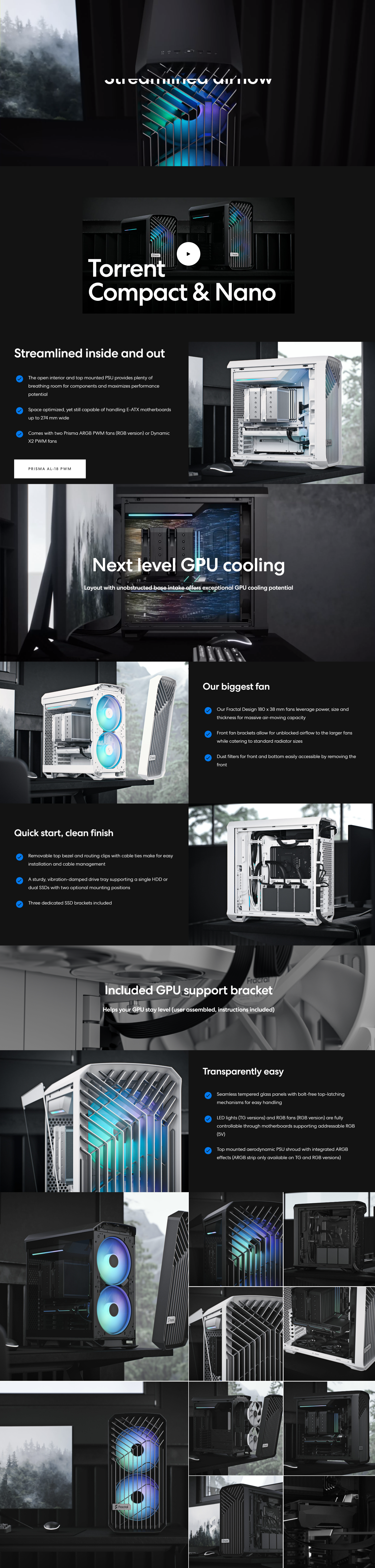 | PACKAGE CONTENTS (RBG VERSION) | Torrent Compact, 2x Prisma AL-18 fans, Accessory box, User manual, GPU support bracket |