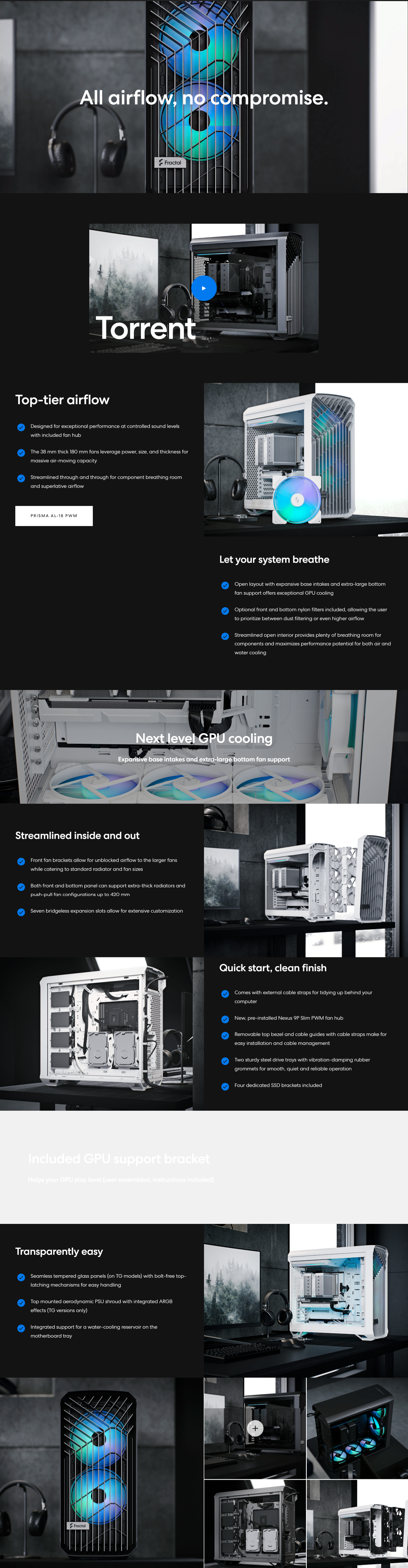 Torrent Compact, 2x Prisma AL-18 fans, Accessory box, User manual, GPU support bracket